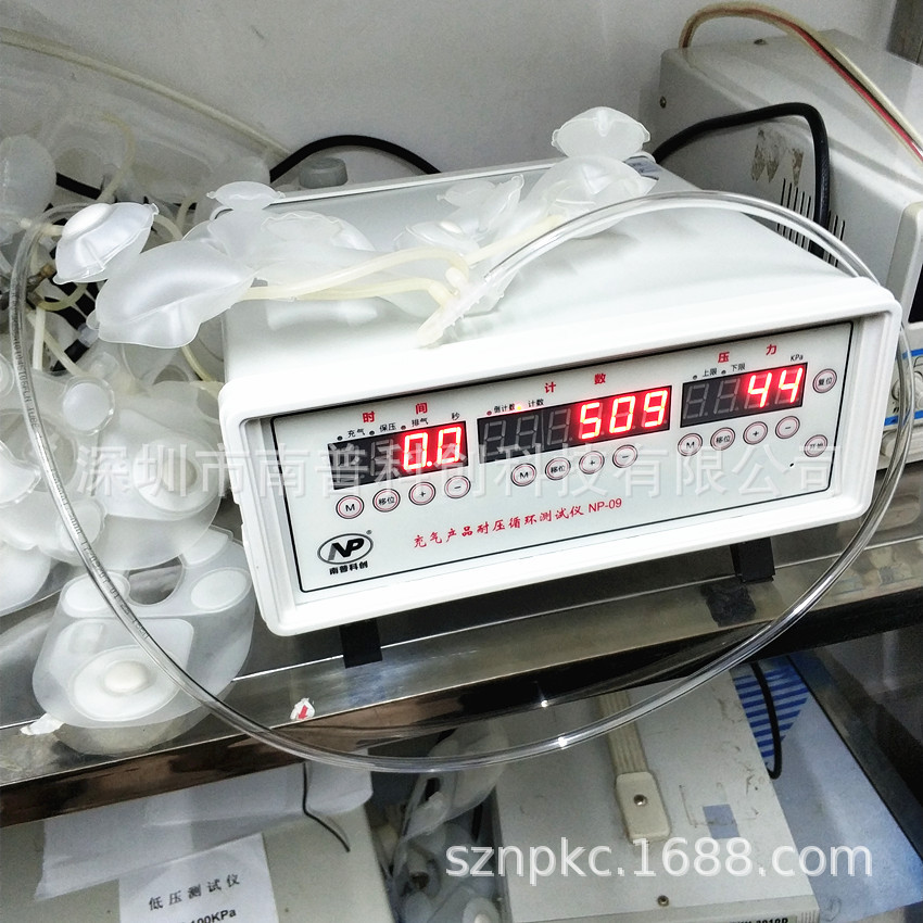 充氣產(chǎn)品耐壓循環(huán)測試儀NP09,采用,計時、計數(shù)、壓力系統(tǒng),應(yīng)用于充氣產(chǎn)品耐壓循環(huán)測試。時間:充氣時間,保壓時間,排氣時間,進行充氣相應(yīng)的系統(tǒng)控;壓力:設(shè)置壓力上下限,當超限時停止測試;計數(shù):測試次數(shù)記錄,即可以設(shè)定測試的次數(shù),也可以不設(shè)置,一直循環(huán)測試;